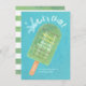 Convide seus convidados para uma festa de aniversário fria com este convite que tem um sorvete verde de picolé azul com um fundo azul ciano verde. Listras verdes e brancas ao contrário. A ilustração recebe uma textura de aquarela. Perfeito para uma festa de aniversário de verão legal e refrescante.Personalize facilmente com os detalhes do seu partido.