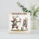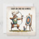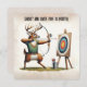 Cartoon buck veer vestindo um colete atirando uma seta em um alvo em um cavalete para uma festa de aniversário. Todo o texto pode ser alterado.