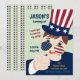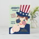 Convide seus convidados para a Festa de aniversário de 4 de julho do seu filho com esta linda ilustração original! É cheio brilhante e colorido! Este Convite de aniversário do Dia da Independência é facilmente personalizado para o seu evento adicionando os seus detalhes. Na frente, ele mostra um garoto convidando amigos para sua festa de aniversário vestindo um chapéu de cima com estrelas e listras. Você encontrará filas de estrelas vermelhas, azuis e brancas no verso deste convite. Este convite é ideal para um nascer infantil nesta data histórica e para um quarto partido temático de julho. Esta ilustração foi inspirada por um símbolo patriótico dos Estados Unidos, Tio Sam.
