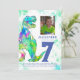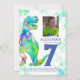 Convite de aniversário de dinossauro colorido com modelo de foto Para o garoto que está fazendo sete anos e ama dinossauros. Este T-Rex itinerante convida os fãs de Dino a uma sétima festa de aniversário divertida. Personalize este convite de aniversário colorido, azul e 7 verde, com uma foto do aniversariante, o número de anos e os detalhes da festa, e você está preparado para um feliz e cheio de dinossauros, no seu aniversário. Todas as espécies de dinossauros são bem-vindas. Arte original única e bela da artista Catherine Sweetman