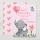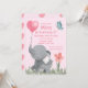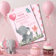 Convide toda a sua família e convidados com este convite de festa de aniversário fofo e feminino. Elefante aquarela segurando um balão em forma de coração, enquanto uma borboleta e flor completam a cena.