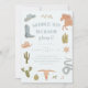 Cartão de convite de aniversário temático ocidental de menino bonito com ilustrações de botas de cowboy, cavalo, cobra, crânio, cacto, chapéus de cowboy, etc. O texto diz "sele-se!"