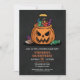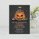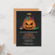 O design de corte apresenta um cheio de abóbora de aquarela de doces e doce ilustração Personalize com seus detalhes de festa de aniversário de Halloween em letras laranja e brancas em fundo de quadro.