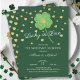Convite de festa de aniversário moderno e divertido com trevo de quatro folhas irlandês e corações dourados. Vire nosso convite de chá de panela de casamento sortudo no amor para encontrar um verso verde coordenado para um toque extra especial.