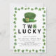 "Prepare-se para celebrar o segundo aniversário do seu pequeno com estilo com o nosso convite de aniversário Dois Sorte! Com um cabeçalho divertido "dois sorte", um chapéu de duende alegre e trevos coloridos em tons de verde, este convite é a maneira perfeita de iniciar as festividades do Dia de São Patrício. Junte-se a nós enquanto brindamos a mais um ano de alegria e risadas com o seu pequeno amuleto da sorte. "