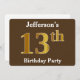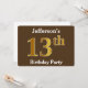 Este design de convite apresenta o número ordinal "13" com uma aparência falsa em forma de ouro. Ele também apresenta um nome personalizável e um fundo castanho. Os detalhes do evento no verso podem ser personalizados. Poderia ser usado para convidar pessoas para a décima terceira festa de aniversário de alguém. [~Z0000015]
