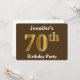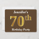 Este design de convite apresenta o número ordinal "70" com uma aparência falsa em forma de ouro. Ele também apresenta um nome personalizado e um fundo castanho. Os detalhes do evento no verso podem ser personalizados. Poderia ser usado para convidar pessoas para a sétima festa de aniversário de alguém. [~Z0000015]