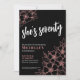 Bom Convite de aniversário de 70 preto, 700, Dourado. Um convite de aniversário divertido, mas elegante, com ouro rosado ou rosa, flores pretas e brancas para os jovens de coração. Por favor, note que não há um martelo de ouro, é apenas uma cor parecida com ela. Um padrão de flor brincalhão enquadra uma tipografia de script "ela tem setenta anos" misturada com uma fonte mais clássica de serifa. Celebrar setenta anos de vida com esta bela design botânica. A parte divertida é que você pode mudar TODAS as cores! Você não só pode mudar as cores e a fonte de fundo, como também pode mudar as linhas das flores. Disponível como um convite impresso ou como um convite digital para download que você pode enviar por e-mail ou que foi impresso localmente!