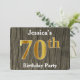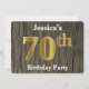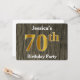 Este design de convite apresenta o número ordinal "70" com uma aparência falsa em forma de ouro. Ele também apresenta um nome personalizado, e uma madeira rústica parece fundo. Os detalhes do evento no verso podem ser personalizados. Poderia ser usado para convidar pessoas para a sétima festa de aniversário de alguém. [~Z0000016]