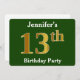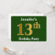 Este design de convite apresenta o número ordinal "13" com uma aparência falsa em forma de ouro. Também apresenta um nome personalizado e um fundo de cor verde. Os detalhes do evento no verso podem ser personalizados. Poderia ser usado para convidar pessoas para a décima terceira festa de aniversário de alguém. [~Z0000013]