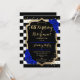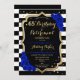 Convite de Festa de Aniversário e Aposentadoria. Design elegante em preto, dourado e azul royal. Apresenta listras pretas e brancas, fonte de letra estilosa, dourado com brilho falso e confetes. Perfeito para uma celebração conjunta de aniversário e aposentadoria glamorosa. Personalize com seus próprios detalhes.