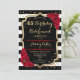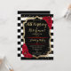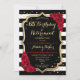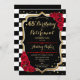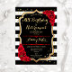 Convite de Festa de Aniversário e Aposentadoria. Design elegante em preto, dourado e vermelho. Apresenta listras pretas e brancas, fonte de letra estilosa, dourado com brilho falso e confetes. Perfeito para uma celebração conjunta de aniversário e aposentadoria glamorosa. Personalize com seus próprios detalhes.