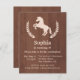 Um convite de aniversário elegante e moderno com uma silhueta de um cavalo com folhas decorativas como a grinalda. Uma textura de madeira para o fundo. Aperfeiçoe para os meninos e as meninas do aniversário que amam cavalos! Personalize facilmente com seus detalhes do partido.