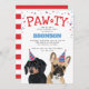 Convites de festas de aniversários bonitos de cachorro com buldogue francês e dachshund, ambos vestindo chapéus de festas, confete vermelho e azul, a palavra "PAW-TY" e um simples modelo de festas de estimação.