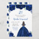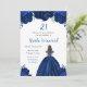 Este convite de aniversário apresenta flores florais azuis, azuis e brilhantes marinhos, e uma bela princesa de cabelo castanho e um vestido elegante. Isto é perfeito para uma festa de aniversário.
