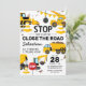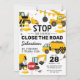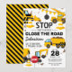 Convites de festa de aniversário temática de construção com um fundo branco simples, com ilustrações de desenhos animados de bandeirolas, placas de pare, um caminhão de despejo, uma escavadeira, um caminhão de concreto, um guindaste de demolição, respingos de terra e um modelo de celebração de aniversário infantil moderno e fácil de personalizar.