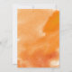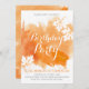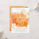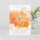Abstrato de cor aquosa moderna salpicos cor laranja convite de aniversário mostrando uma tinta à mão pintada com tinta de aquarela com textura em laranja, folhas de maple em branco com veias de coral e texto em branco e cinza.