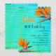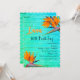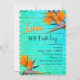 Convites de festa de aniversário temática Luau. Flores laranja de ave-do-paraíso e design de madeira azul-turquesa. Personalize o texto em três lugares. A borda rendilhada mostrada é uma de muitas opções. Altere a redação se a festa não for um luau. A idade do homenageado pode ser incluída nesse modelo, ou removida completamente.