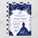 Este elegante e glamouroso convite de aniversário apresenta uma bela princesa com cabelo castanho e pele escura num vestido azul de marinho. O texto combina o script manuscrito e as fontes sans serif modernas para um aspecto elegante e sofisticado. Os arranjos florais, borboleta e confete criam a mistura perfeita de rústico e chic. Gráficos por www.etsy.com/uk/shop/SunflowerDayLove