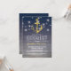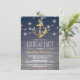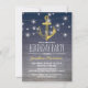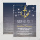 Convites de aniversário masculinos adultos com fundo degradê azul de madeira rústica, uma âncora dourada brilhante, luzes cintilantes de corda de convés de porto e texto moderno em branco.