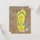 Chinelo amarelo brilhante na areia com conchas para festa na praia.