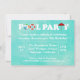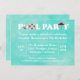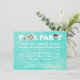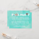 O design apresenta um fundo de aquarela em uma bonito cor azul aqua. O texto diz FESTA PISCINA com a letra "O" representada por uma bola de praia e salva-vidas. O "T" é um guarda-chuva do pátio vermelho. Este é um convite bonito e divertido para uma festa de piscina no quintal ou na vizinhança.