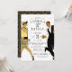 Este convite de festa de aniversário dos anos 20 inclui um design de frente e verso que mergulha totalmente os convidados num tema glamoroso dos anos 20. A frente apresenta uma cena festiva com uma garota flapper e um homem elegantemente vestido dançando contra um pano de fundo de confetes dourados, enquanto uma tipografia vintage ousada destaca os detalhes do evento. O design de verso coordenado apresenta um padrão de vieiras preto e dourado contínuo, realçando o ambiente opulento de speakeasy. Perfeito para um aniversário marcante ou celebração temática, este design exala sofisticação, diversão e charme da era Gatsby que prepara o cenário para uma festa inesquecível.