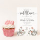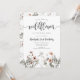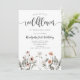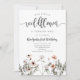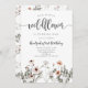 Convite de festa de aniversário para menina caprichosa com ilustração de aquarela de flores silvestres em rosa e branco. O texto diz "nossa pequena flor selvagem está fazendo XX."