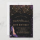 Para um aniversário elegante de 50 anos (ou qualquer idade). Um fundo na moda preto. Decorado com pó de ouro falso púrpura e pó de luz ouro, um calçado de stiletto púrpura. Personalize e adicione um nome, idade e detalhes da festa. O nome é escrito com um script de estilo manuscrito