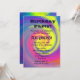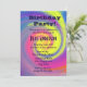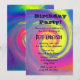 Convite de festa de aniversário psicodélico alucinante. Uma espiral abstrata brilhante e colorida de cores. Um caleidoscópio de cores que giram em torno de um redemoinho espiral. Arco-íris vibrante e brilhante de cores como amarelo, rosa, roxo e azul. Personalize com os detalhes da sua festa.
