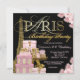 Convite de festa de aniversário de Paris com bela Torre Eiffel dourada, elegantes pacotes de presentes de Paris, sapatos de salto alto dourados e elegante texto dourado de Paris em um rico fundo floral rosa e preto. Este lindo convite de festa de aniversário de Paris é facilmente personalizado para o seu evento, basta adicionar seus detalhes no estilo de letra e cor, e texto de sua escolha. Este é um design impresso sem diamantes, joias, lantejoulas, etc. reais.