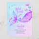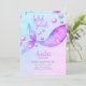 Convite de aniversário de sereia com cauda mágica de sereia e tipografia decorativa. Este design de conto de fadas fantástico apresenta uma cauda das sereias e bolhas oceânicas em tons de aquarela de verde roxo rosa e azul. Fácil de editar para qualquer idade e perfeito para festa de sereia, festa de piscina, princesa feminina e sob os temas do mar.