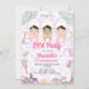 Trate seus convidados a um dia de mimos com este adorável e colorido convite de aniversário de spa! Com três meninas fofas relaxando em roupões e toalhas com máscaras faciais, tratamentos de olhos de pepino e rolos de jade, todas cercadas por acessórios de spa encantadores em aquarela — sais de banho, perfume, lixas de unha, uma escova de cabelo, velas e folhas de palmeira tropicais exuberantes — contra um fundo impresso com leopardo roxo e rosa pastel caprichoso. Este design deliciosamente divertido captura perfeitamente a experiência definitiva de dia de spa para meninas.