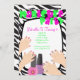 Comece a comemorar com esta adorável convite de festas de spa/Manicure. Seja em casa de festas ou fora, as meninas adoram ser mimadas em qualquer idade. Este convite tem duas mãos, ambas com unhas lindamente polidas. Há duas garrafas de verniz de unha: rosa e roxo com brilho ou brilho nela perto do fundo do convite. O topo tem um tom brilhante que solta a "festa do manicure" em verde limão e rosa quente/roxo. O plano de fundo é a impressão em branco e preto. Veja os muitos outros produtos e design nesta linha adorável. ©JW Ilustrations