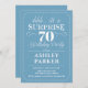Convite de aniversário de 70 surpresa. Design simples em azul claro e branco. Apresenta uma fonte elegante de script. Celebração surpresa para homem ou mulher. Pode ser personalizado em qualquer idade!