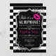 Convite de aniversário surpresa. Design branco preto elegante com prata brilhante falso. Apresenta lábios cor-de-rosa beijando, listras brancas pretas, confetti e fonte de script. Perfeito para uma bolsa mensageifesta de aniversario elegante. Pode ser personalizado em qualquer idade! Envie-me uma mensagem se precisar de mais personalização.