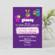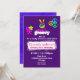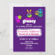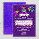 Um convite de aniversário totalmente incrível. Decorado com elementos psicodélicos groovy. Uma mão colorida fazendo o sinal da paz em cores de arco-íris. Flores e sinais de paz circulares no estilo dos anos 60. Fundo roxo. Um design colorido e legal.
