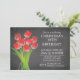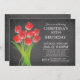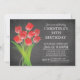 Enfie sua festa de aniversário fora do direito com nosso buquê bonito do convite de festas vermelho das tulipas que caracteriza um grupo contemporâneo das flores vermelhas da tulipa ajustadas em um fundo do quadro.  Lance nossa festa de aniversário floral da flor para adultos sobre para encontrar um quadro de harmonização traseiro para um toque especial extra!  Disponível em nossa loja em uma variedade de escolhas da cor da tulipa.  Escolha perfeita para um aniversário de 21 anos, aniversário de 30 anos, aniversário de 40 anos, 50th aniversário.
