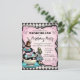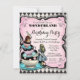 Alice no convite de aniversário da Terra Maravilha com xícaras de chá bonito em um fundo de diamante preto e rosa antigo. Este convite de aniversário Wonderland fofo é facilmente personalizado para o seu evento simplesmente adicionando os seus detalhes no estilo de letra, cor e texto da sua escolha.