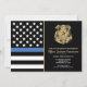 Este design apresenta uma bandeira da força policial com listras pretas e brancas e uma faixa fina azul também. O distintivo da polícia e o texto em ouro ficam acima de todos os detalhes da festa para a aposentadoria do oficial de aplicação da lei, xerife, capitão ou chefe de polícia.