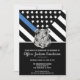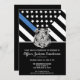 Este design apresenta uma bandeira da força policial com listras pretas e brancas, e também uma faixa com a linha azul fina. O distintivo da polícia e o texto prateado estão acima de todos os detalhes da festa para a aposentadoria do oficial de aplicação da lei, xerife, capitão ou chefe de polícia.