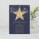 Este convite de festa de aposentadoria em azul marinho elegante com estrelas douradas pode ser personalizado com todas as informações da sua celebração especial e foto no verso. Criado por Thisisnotme©
