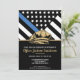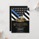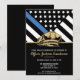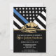 Este design apresenta uma bandeira da força policial com listras pretas e brancas, e uma faixa da linha azul fina também. O chapéu de policial e o texto em dourado ficam acima de todos os detalhes da festa para a aposentadoria do oficial de aplicação da lei, xerife, capitão ou chefe de polícia.