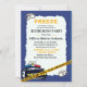Chamada de aposentadoria Humorous Blue e Yellow para um policial. A design tem um carro policial, uma linha policial amarela não cruza gráficos, algemas de mão e as palavras congelam. Fácil de personalizar com os detalhes da sua festa.