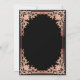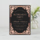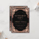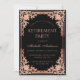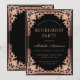 Este convite de festa de aposentadoria preto e rosa (dourado rosado) elegante com um ar vintage, recomendado para uma mulher, tem uma moldura ornamentada com folha de ouro (falso) dourado rosado com decorações barrocas elegantes em fundo preto. O nome é escrito em uma caligrafia elegante. Todo o texto pode ser personalizado e tem uma cor rosa semelhante à moldura dourada rosada.