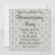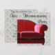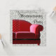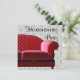 Convite de festa de aquecimento da casa com sofá vermelho moderno e damasco.