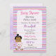 Convites de festa de bebê de menina hispânica ou afro-americana com ursinho com fundo roxo e rosa.