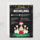 Convite de festas de Natal de Férias. Junte-se a nós para uma festa de boliche festiva! Este convite apresenta um design divertido com chapéus de Papai Noel em um alfinete de boliche e chifres de renas em uma bola de boliche vermelha, todos colocados contra um fundo de neve cheio de flocos de neve. A frente da placa tem um fundo preto, enquanto a parte traseira está vermelha brilhante. Sinta-se livre para personalizar o convite com suas informações. Não se esqueça de vestir seu suéter mais feio e trazer um presente para nossa troca!