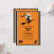 Este elegante convite para festas do Dia das Bruxas, com bruxas voadoras e morcegos, vexos e chapéus de bruxa, em listras brancas pretas, a tipografia de letras negras do festival do Halloween com fundo laranja. É uma maneira perfeita de adicionar um toque de encantos góticos à festa do Halloween. Você pode facilmente alterar todos os detalhes clicando em opções de personalização.
