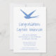 Cartão de convite azul e branco elegante para celebrar a promoção de um piloto de linha aérea ou de um novo formando da escola de voo ou de qualquer "passageiro nobre". Engole branca contra um céu azul. Todos os textos são totalmente personalizáveis.